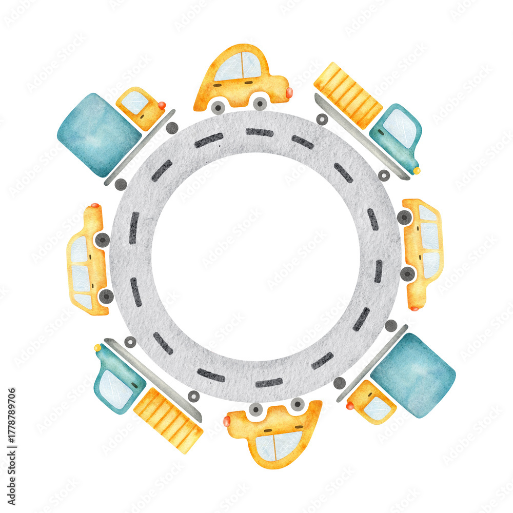 Frame of city street road and truck cars. Isolated hand drawn wreath of urban carrier on driveway in children style. Layout nursery template for kids goods, card, stationery, poster #1778789706