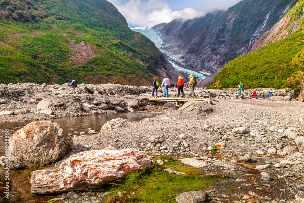 Franz Josef Glacier - Brightly dressed tourists approaching the terminal face of Frans Josef Glacier by crossing a wooden bridge. West Coast, New Zealand #1761983368