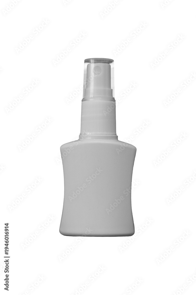 Frasco spray vazio branco em formato ergonômico com bico pulverizador transparente, corpo opaco curvo, tampa rosqueável e rótulo liso, isolado em fundo branco, alta resolução e texturas plásticas #1946016914