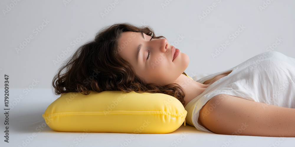 Frau liegt auf Gesundheitskissen. Nackenschmerzen Kissen Bettwäsche #1792009347