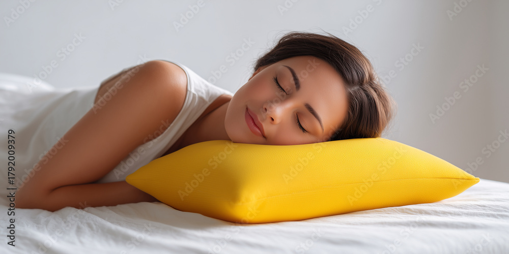 Frau liegt auf Gesundheitskissen. Nackenschmerzen Kissen Bettwäsche #1792009379