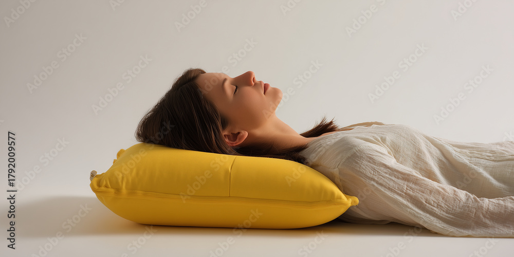 Frau liegt auf Gesundheitskissen. Nackenschmerzen Kissen Bettwäsche #1792009577