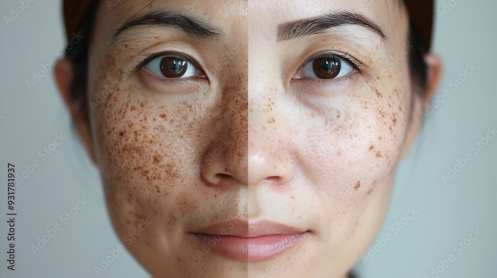 Freckles and Spot melasma pigmentation skin facial treatment over Asian woman faceWrinkles melasma Dark spots freckles dry skinProblem skincare and health concept Before and after : Generative AI #931781937