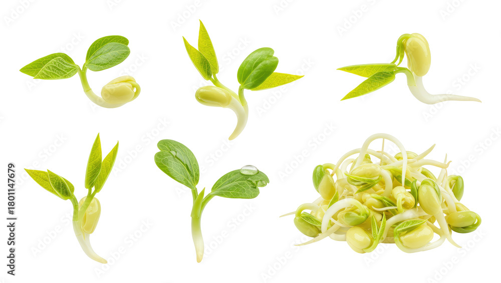 Fresh bean and alfalfa sprouts with white stems and green leaves, arranged in small clusters #1801147679