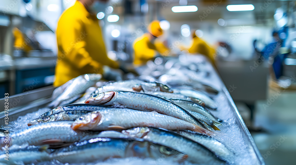 Fresh Catch Processing: An array of fresh fish is meticulously laid out on a refrigerated table, the centerpiece of a bustling fish processing facility where dedicated workers. #1347382433