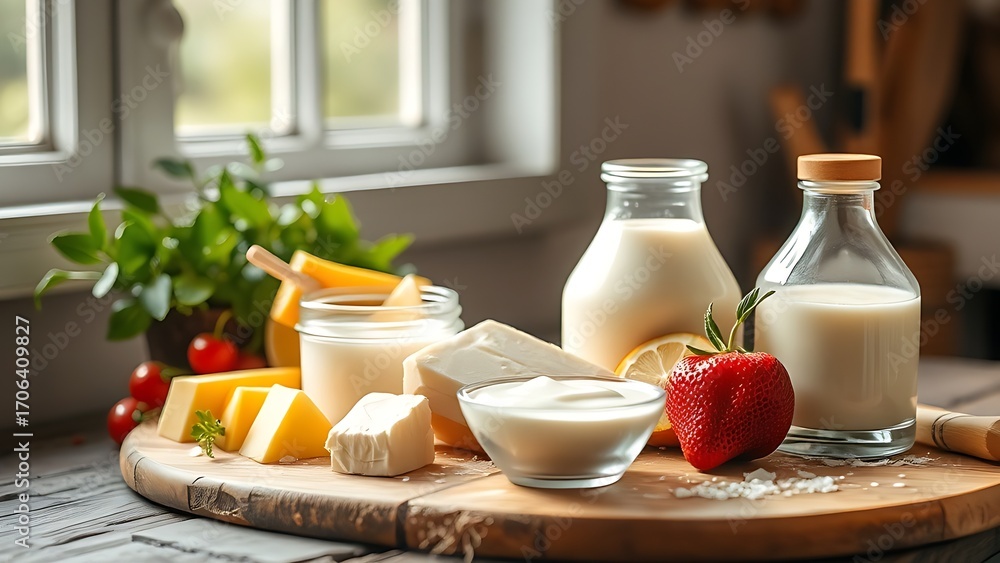 Fresh dairy products arranged artistically on a rustic wooden surface with warm morning light. #1706409827