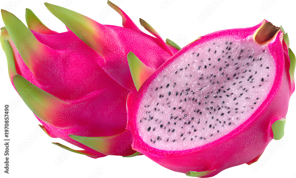 Fresh dragon fruit whole and sliced for exotic tropical nutrition, isolated cutout #1970857490