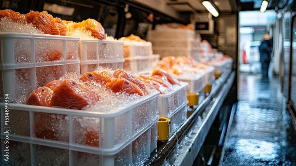 Fresh fish in ice-filled containers, displayed for sale #1514899354