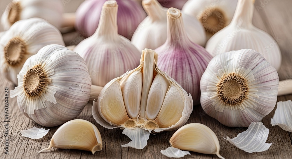 Fresh garlic bulbs and cloves artfully arranged on rustic wooden surface, ready for culinary creation and healthy cooking inspiration #1770244620