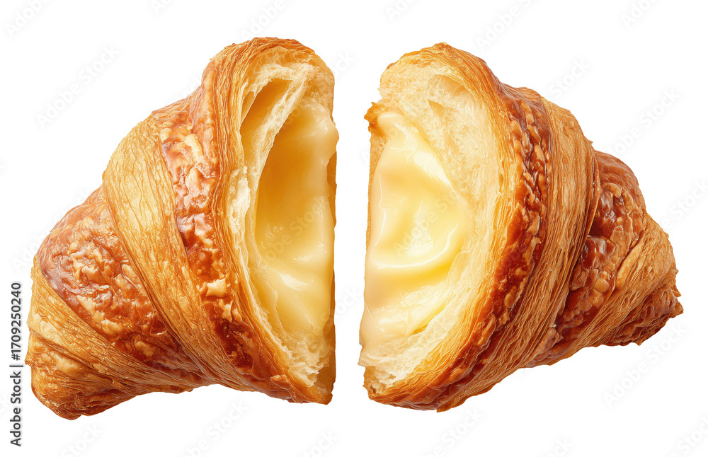 Fresh golden croissant cut in half isolated on transparent background, top view #1709250240