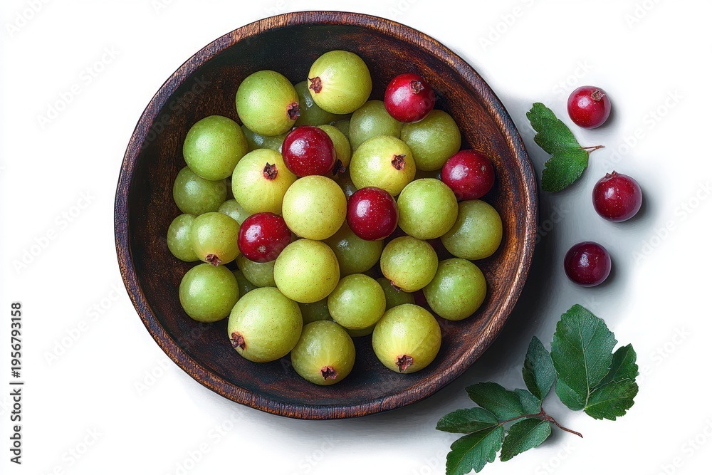 fresh green and red gooseberries in a rustic wooden bowl with green leaves on a white background, bright and refreshing still life #1956793158