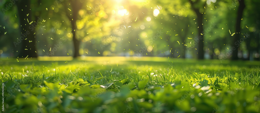 Fresh Green Grass with Soft Sunlight and Blurred Park Background #1929230242