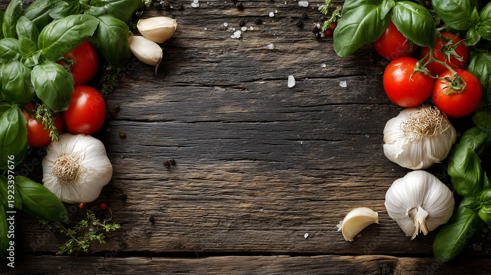 Fresh herbs and vegetables arranged on a rustic wooden table for cooking #1923397676