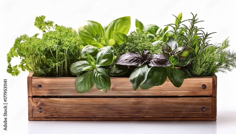 fresh herbs leafy greens flourish in rustic wooden planter superfoods healthy food eco gardening isolated on white background #1779531141