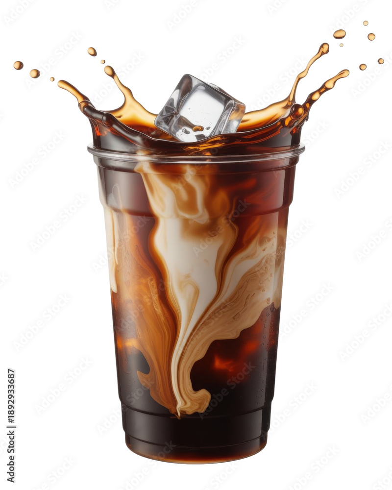 Fresh iced latte coffee pouring into plastic cup with splash and ice cubes in motion scene #1892933687