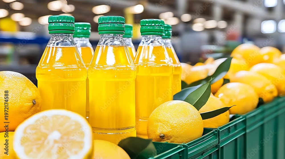 Fresh Lemonade Bottles Surrounded by Bright Yellow Lemons in a Grocery Store Display #1972174588