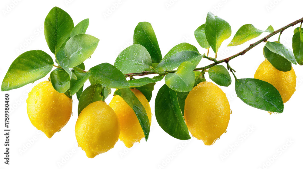 Fresh Lemons on Branch Citrus Tree Green Leaves Water Droplets Vitamin C Rich #1759980460
