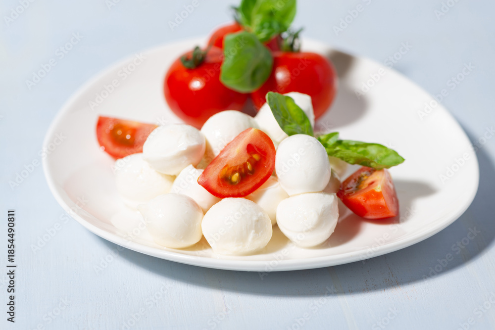 Fresh mozzarella and juicy tomatoes with basil on a plate #1854490811