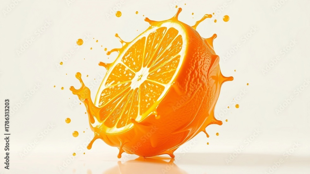 Fresh orange slice exploding with vibrant juice splash, dynamic 3D render of citrus fruit and liquid motion on light background. #1786313203