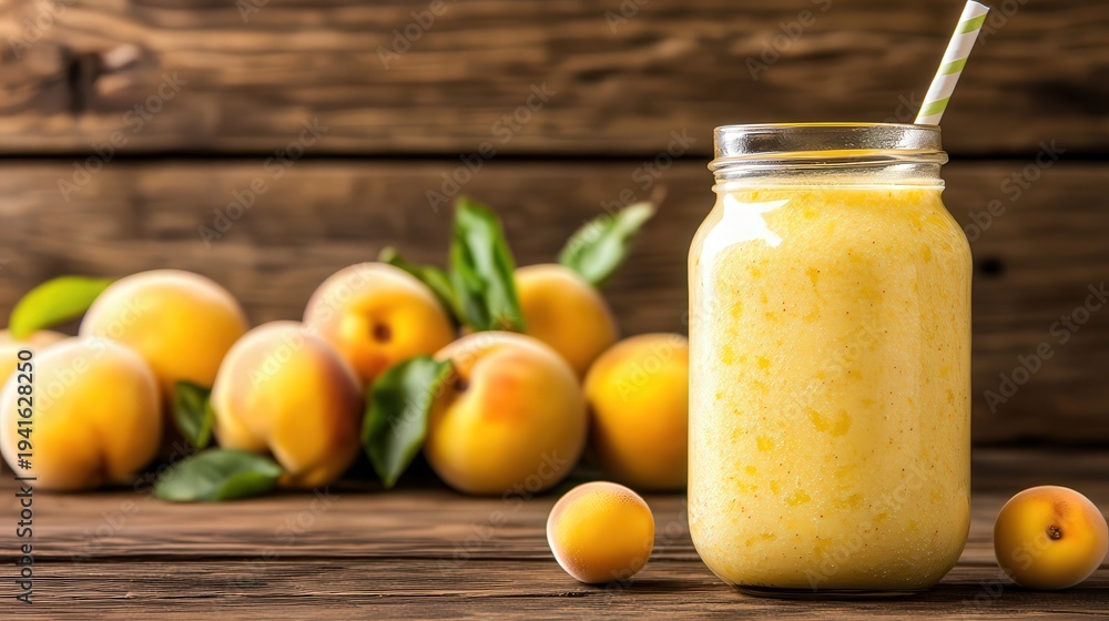 Fresh peach smoothie in a glass jar with a straw, surrounded by ripe peaches on a rustic wooden background, Ideal for health-related content, recipes, or summer beverage promotions, #1941628250