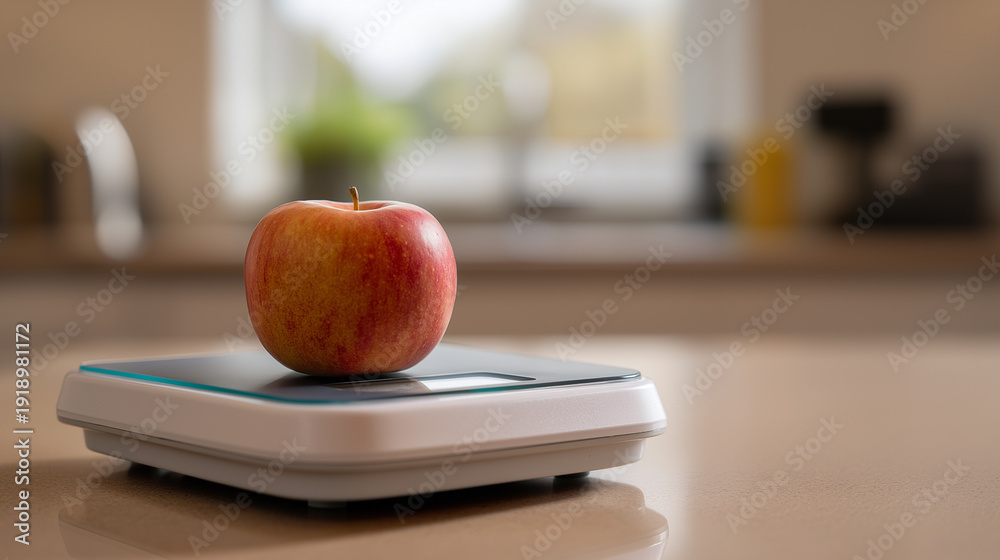 Fresh red apple on a sleek digital kitchen scale on a clean countertop, symbolizing precise portion control, calorie tracking, healthy eating and mindful weight management, copy space #1918981172