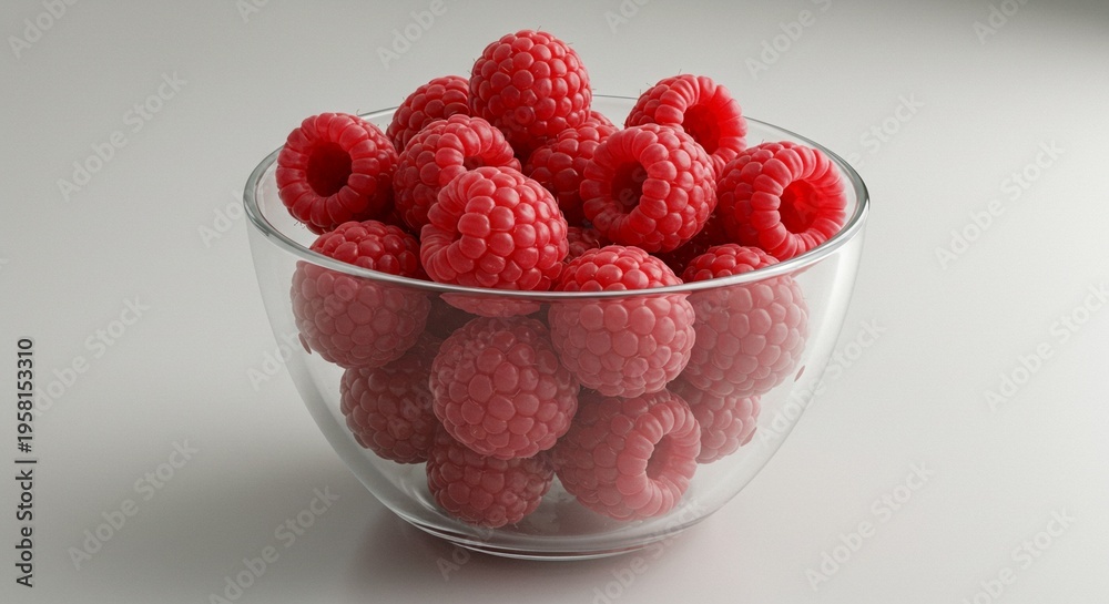 Fresh ripe red raspberries in a clear glass bowl on a plain background #1958153310