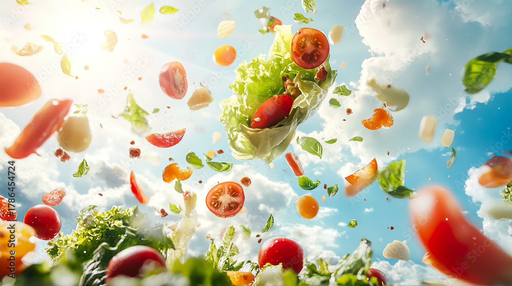 Fresh salad ingredients levitating in a vibrant sky, a healthy food paradise for World Vegan Day, Veganuary, International Vegan Cuisine Month, World Vegan Month #1786454724
