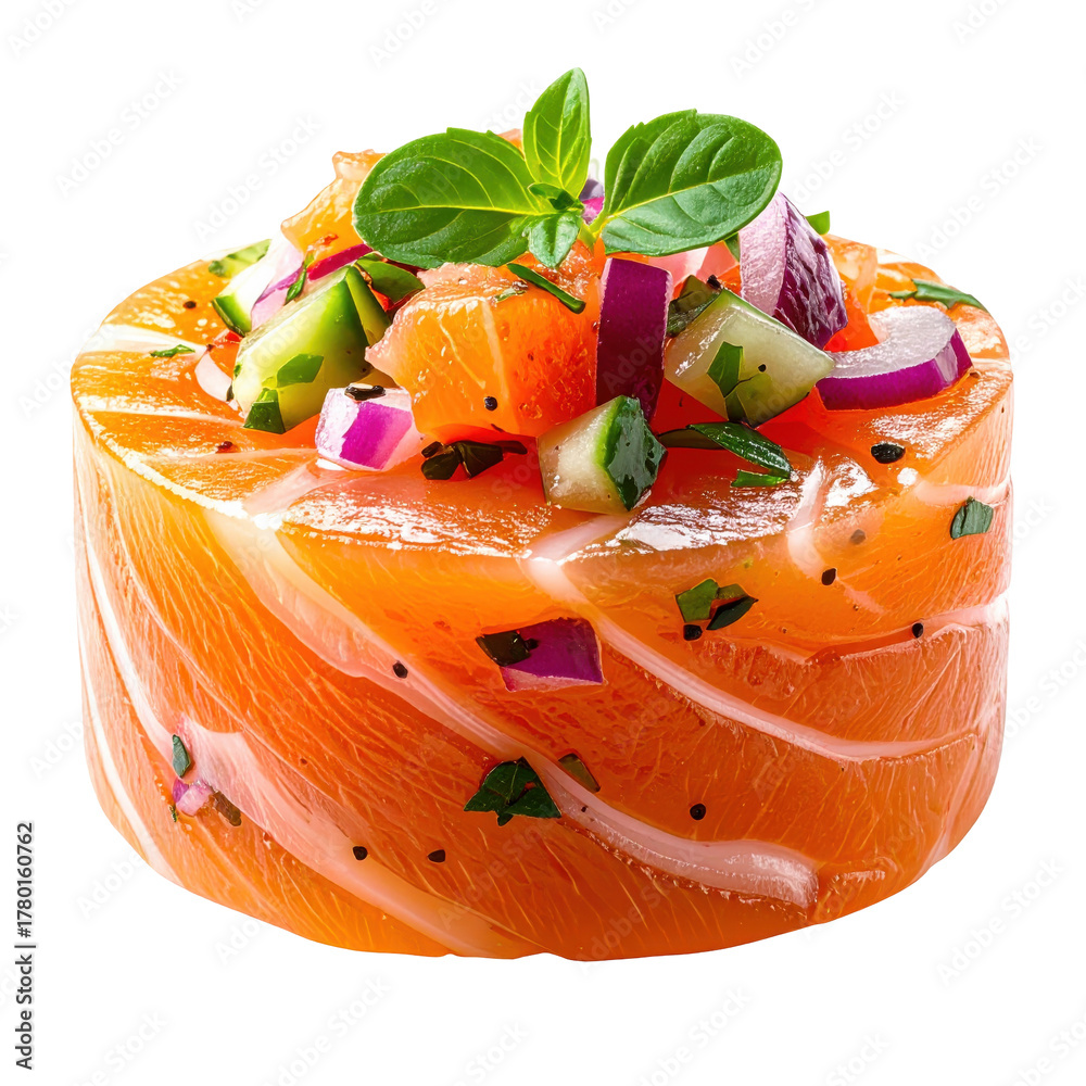 Fresh salmon tiradito isolated on white, featuring vibrant slices of raw fish in a creamy yellow aji amarillo and lime sauce #1780160762