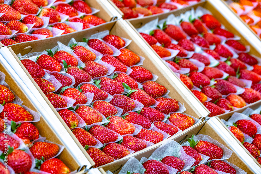 Fresh strawberries put out for sale in a grocery store #1967114479