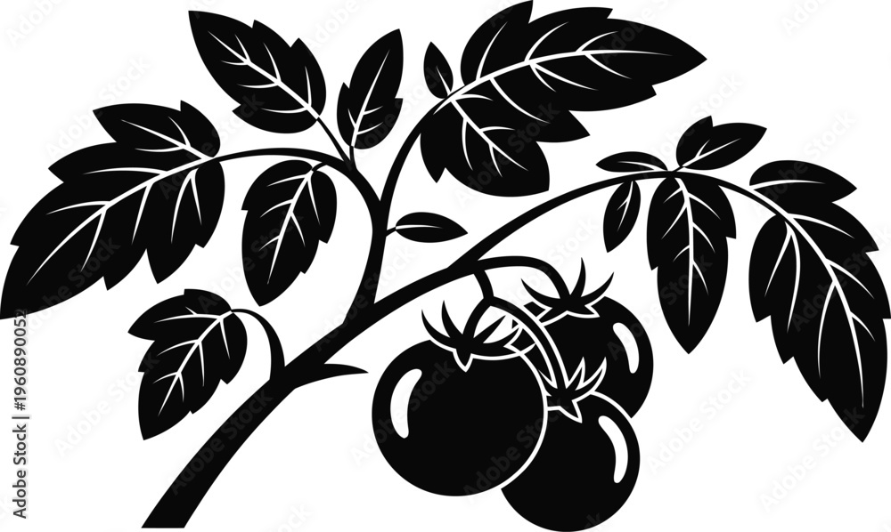 Fresh tomato plant branch with ripe tomatoes and green leaves vector illustration. #1960890052