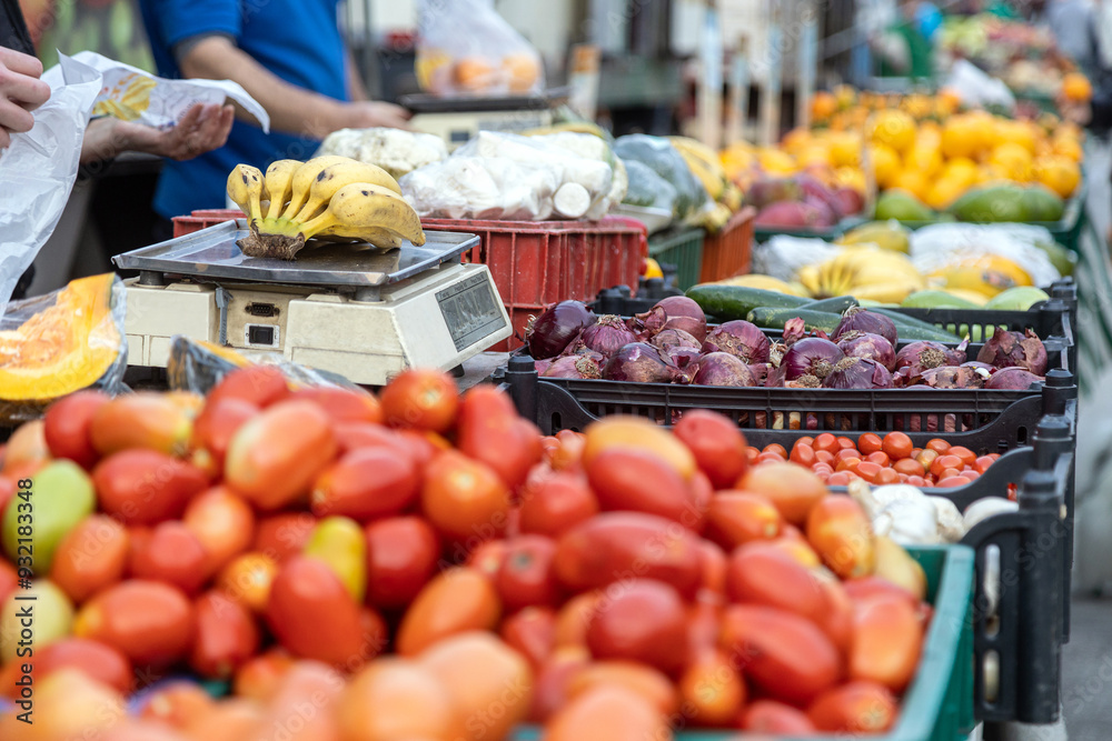 Fresh vegetables and fruits with a scale at a farmer's market in Caxias do Sul, Rio Grande do Sul, Brazil #932183348