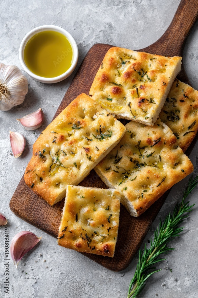 Freshly baked focaccia with rosemary and garlic on wooden board #1908134119