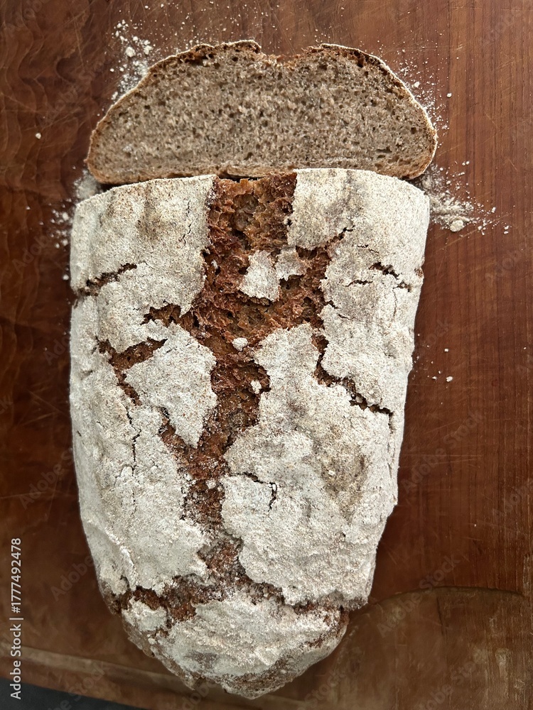 freshly baked sourdough bread sliced on wooden cutting board, directly above #1777492478