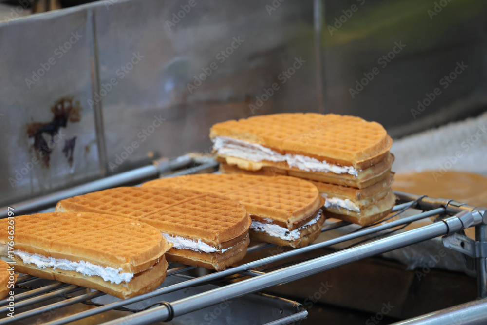 Freshly made Korean street waffles with whipped cream filling cooling on a metal rack #1764626197