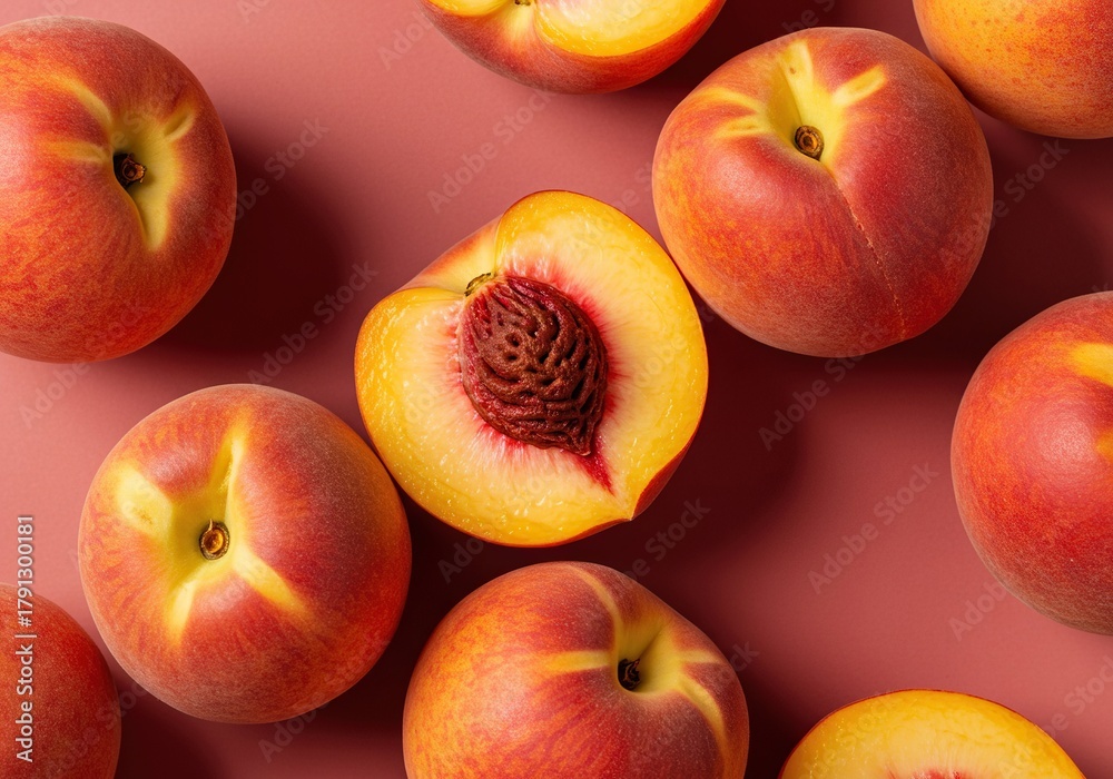 Freshly picked, succulent peaches arranged artfully, highlighting their natural sweetness and appealing orange-pink hues ,yellow ,fresh ,fuzzy #1791300181