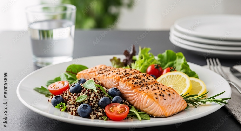 Freshly Prepared Salmon Fillet on a Bed of Mixed Greens with Berries and Lemon Slices for Healthy Gourmet Meal Presentation in a Modern Dining Setting #1978158859