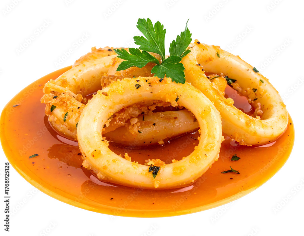 Fried calamari rings served on an orange plate, with parsley and a light sauce #1768925126
