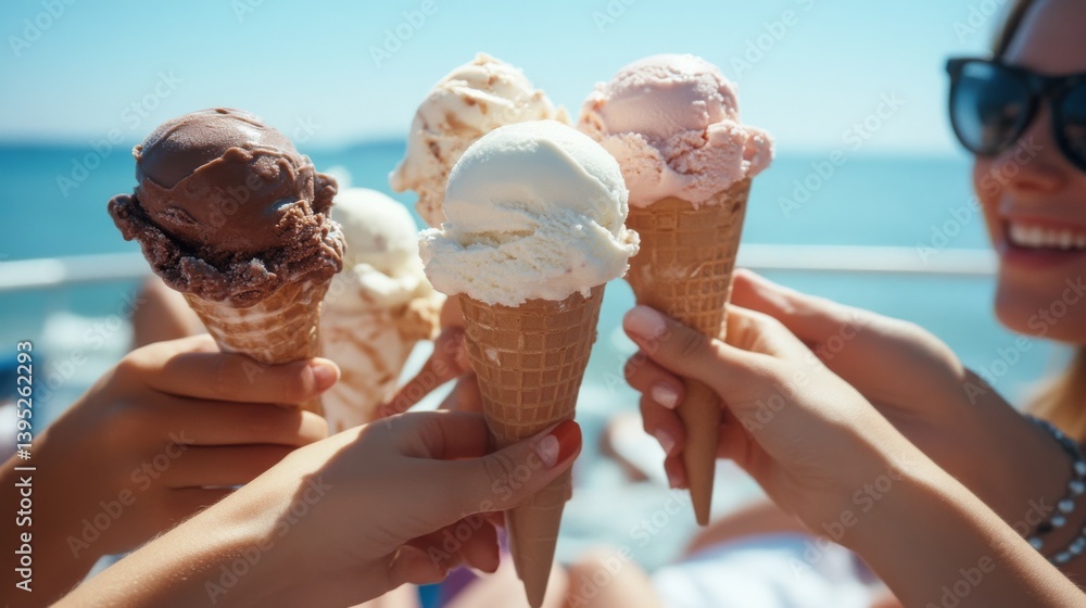 Friends enjoy joyfully sharing ice cream cones by the seaside, celebrating a sunlit, carefree day. #1395262293