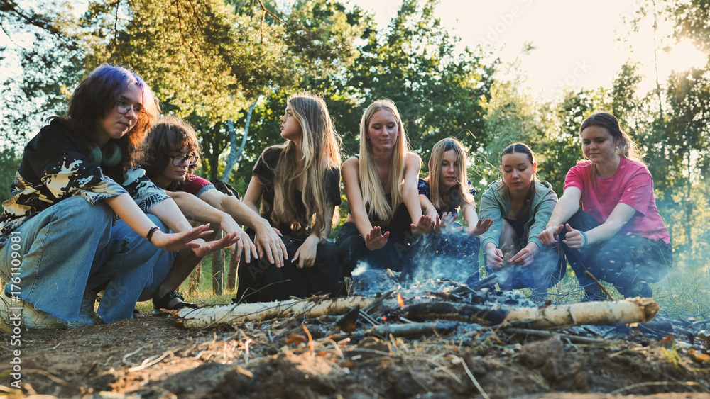 Friends huddling around glowing campfire in lush forest, sharing laughter during summer wilderness adventure #1761109081