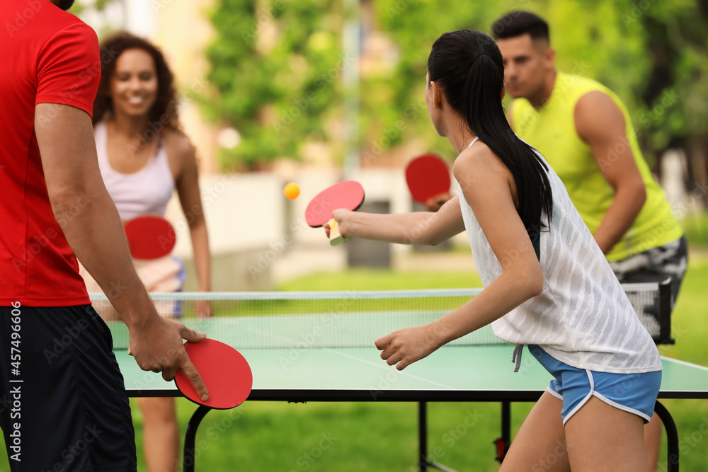 Friends playing ping pong outdoors on summer day #457496606