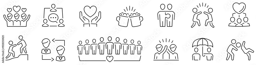 Friendship icons. Relationship icon set. Related friends. Editable stroke. Vector illustration. #1928350420