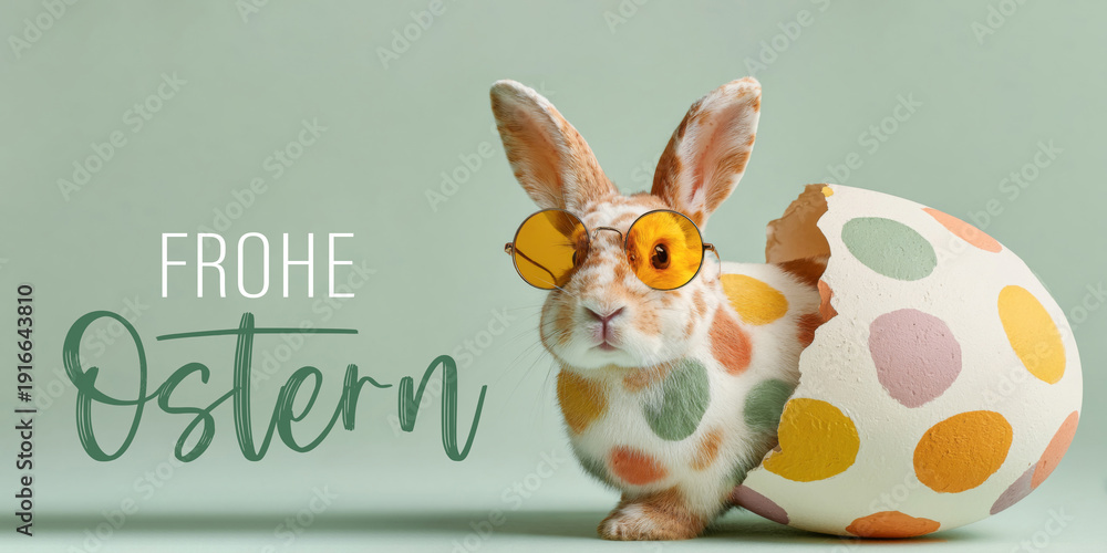 Frohe Ostern Konzept, Ferien Feiertag Grußkarte, Karte mit deutschem Text - Lustiger Osterhase mit Sonnenbrille und bunten Ostereier, isoliert auf grünem Hintergrund #1916643810