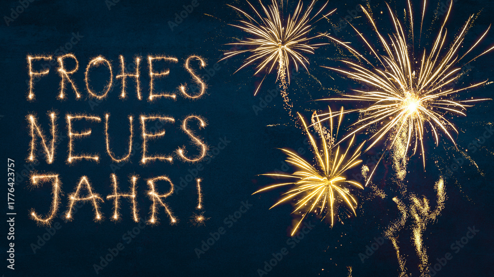 Frohes neues Jahr Grußkarte, Silvester Karte mit deutschem Text - Rahmen aus goldenem Feuerwerk, isoliert auf blauem Hintergrund #1776423757