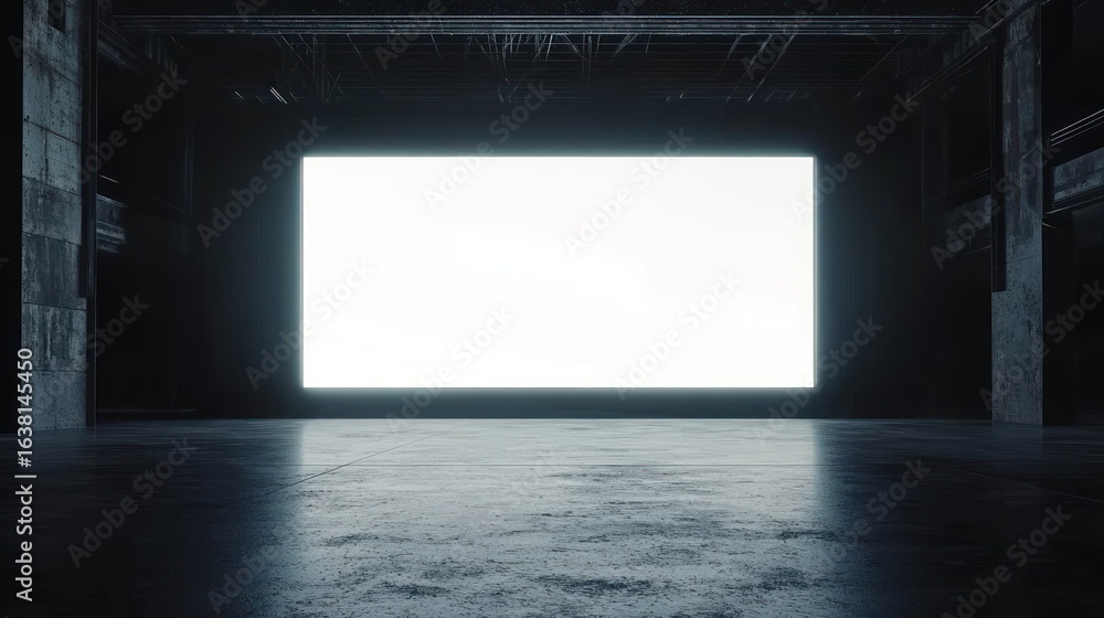 Front view of blank white glowing digital screen in dark hall interior with concrete floor and black wall. Presentation concept. Mockup, closeup, 3D Rendering #1638145450