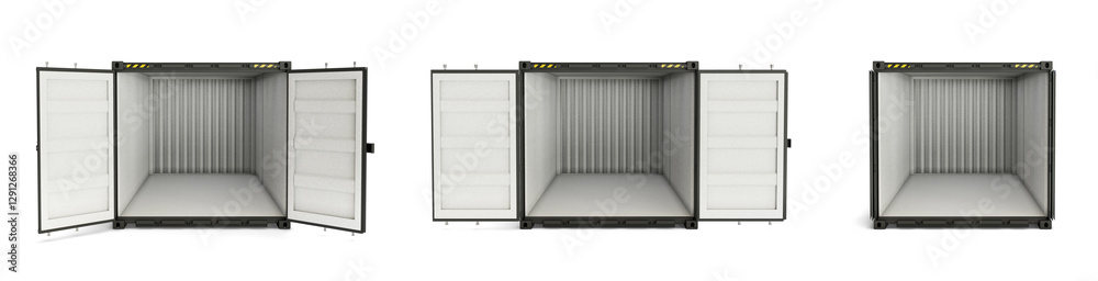 Front view of intermodal container with open doors. Black cargo container for storage, transportation goods. Isolated on a white background. 3D illustration #1291268366