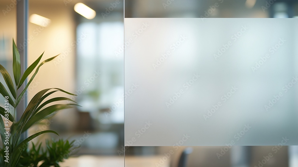 Frosted glass panel with copy space in a modern office with green plants and a blurred background #988581298