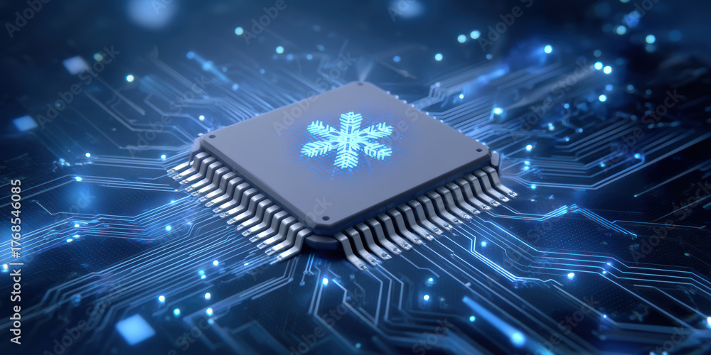 Frozen chip cooling concept snowflake on microprocessor glowing circuitry, futuristic tech vibe #1768546085