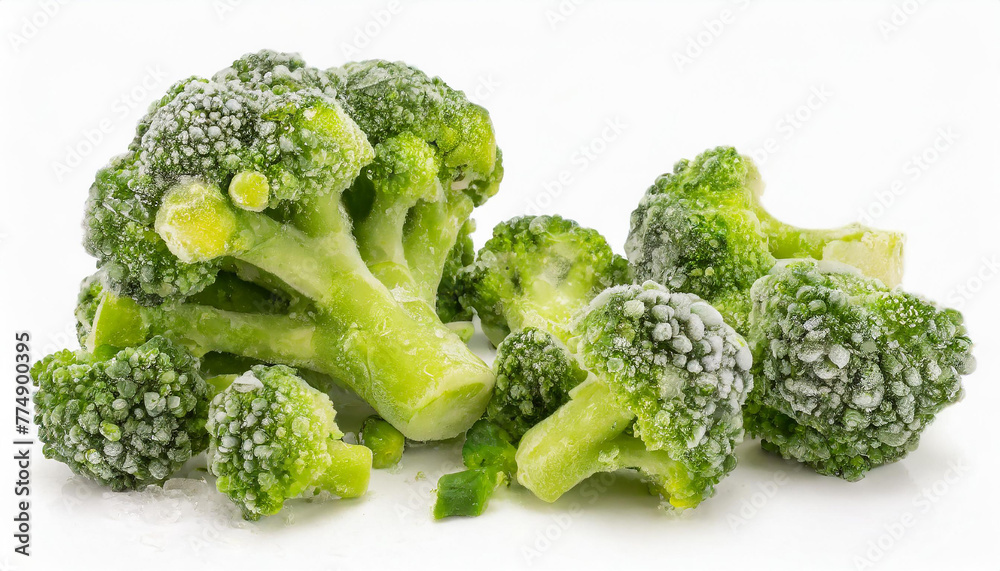 Frozen green broccoli. Delicious vegetable. Organic food. Isolated on white background. #774900395