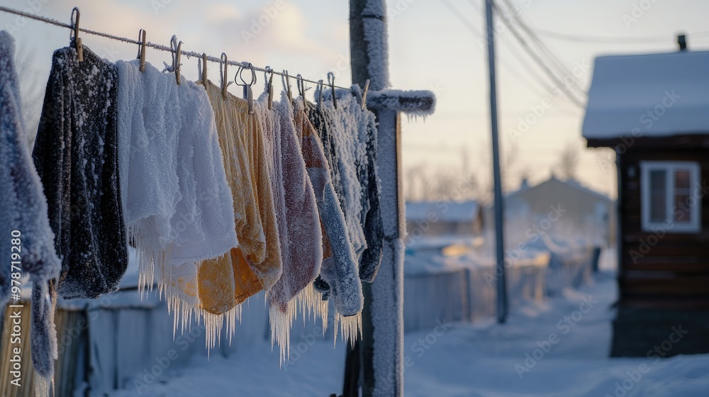 Frozen laundry hanging on a line in Oymyakon, stiff from the extreme cold. #978719280