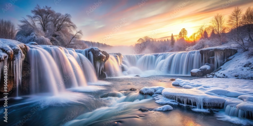 Frozen waterfalls in misty dawn light showcasing inflexibility of nature's force amidst serene atmosphere in slow shutter speed #950086759